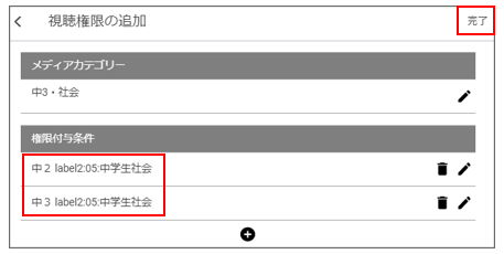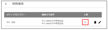 2024.08.30 2024.09.11 視聴権限の設定 115view 【管理者用】メディアライブラリ管理 お気に入り 「メディアライブラリ管理」>「視聴権限」からユーザーの視聴権限を設定します。 視聴権限の画面 追加アイコンを選択します。 メディアカテゴリーの設定 メディアカテゴリーの追加アイコンを選択します。 対象のメディアカテゴリー名の一部を検索欄に入力し、Enterキーを押して検索します。検索欄をブランクのままEnterキーを押すと、全てのメディアカテゴリーが表示されます。対象のメディアカテゴリーにチェックを入れ、「次へ」を選択します。 権限付与条件の設定 視聴権限の追加アイコンを選択します。 権限付与条件を設定します。 学年ボタンや「label」ボタンを選択し、「次へ」を選択します。 「label」ボタンを選択すると、「f_studentData」もしくは「生徒ユーザー」で設定したlabel条件がプルダウンに表示され、検索項目として追加できます。 ※設定した項目全てを満たす生徒を検索するAND検索となりますので、複数の学年を指定しないでください。 (正)「中3 label1:内部生」 → 中学3年生で内部生である生徒が対象となります。 (誤)「中2 中3 label1:内部生」 → 対象生徒は存在しません。 別の条件を設定する場合 権限付与条件を追加後に別の条件を設定したい場合はもう一度、権限付与条件の追加アイコンを選択してください。 条件が複数設定された場合は、いずれかの条件を満たすユーザーを検索するOR検索となります。 例. 以下のとおり設定すると、「中学2年生で中学生社会を受講」または「中学3年生で中学生社会を受講」の生徒が対象となります。 「完了」を選択 権限が付与されたユーザーで映像授業が視聴可能となります。 視聴権限の「人数」に権限が付与されたユーザー数が表示されます。 ■視聴権限の変更・削除 設定した視聴権限を変更するには編集アイコンを選択し、メディアカテゴリー、権限付与条件を変更してください。 設定した視聴権限を削除するには削除アイコンを選択します。 一覧に戻る 関連記事 メディアの設定(再使用) 2024.08.29 WinSCPの初期設定(メディアアップロード用) 2024.08.29 メディアカテゴリーの設定 2024.08.29 映像授業用動画ファイルの設定手順 2024.08.29
