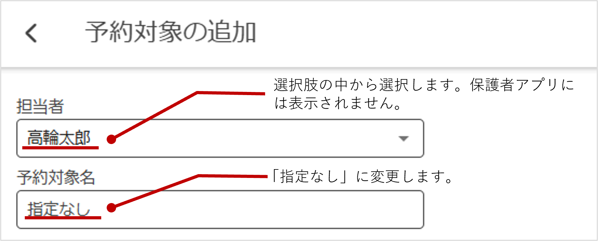 2025.01.27 2025.01.28 予約対象者を「指定なし」にすることはできますか? 183view 予約,よくある質問 お気に入り 可能です。担当者名を選択後、自動入力された予約対象名を「指定なし」に変更してください。 予約アイテムの「予約対象名」>「担当者」と「予約対象名」を以下の図のように設定します。 担当者を選択すると、予約対象名に担当者名が入りますが、「指定なし」に変更し、完了してください。 保護者アプリでは予約対象名に入力した内容が表示されます。 一覧に戻る 関連記事 予約機能画面の説明 2023.02.10 「以下のユーザーは保護者登録が未完了のため、お知らせが配信されません。」と表示されます 2024.10.03 出席アプリのアクティベーションパスワードがわかりません 2025.05.09 削除済生徒ユーザーのカスタマーコードを新規生徒ユーザーに付与してもいいですか? 2024.04.15