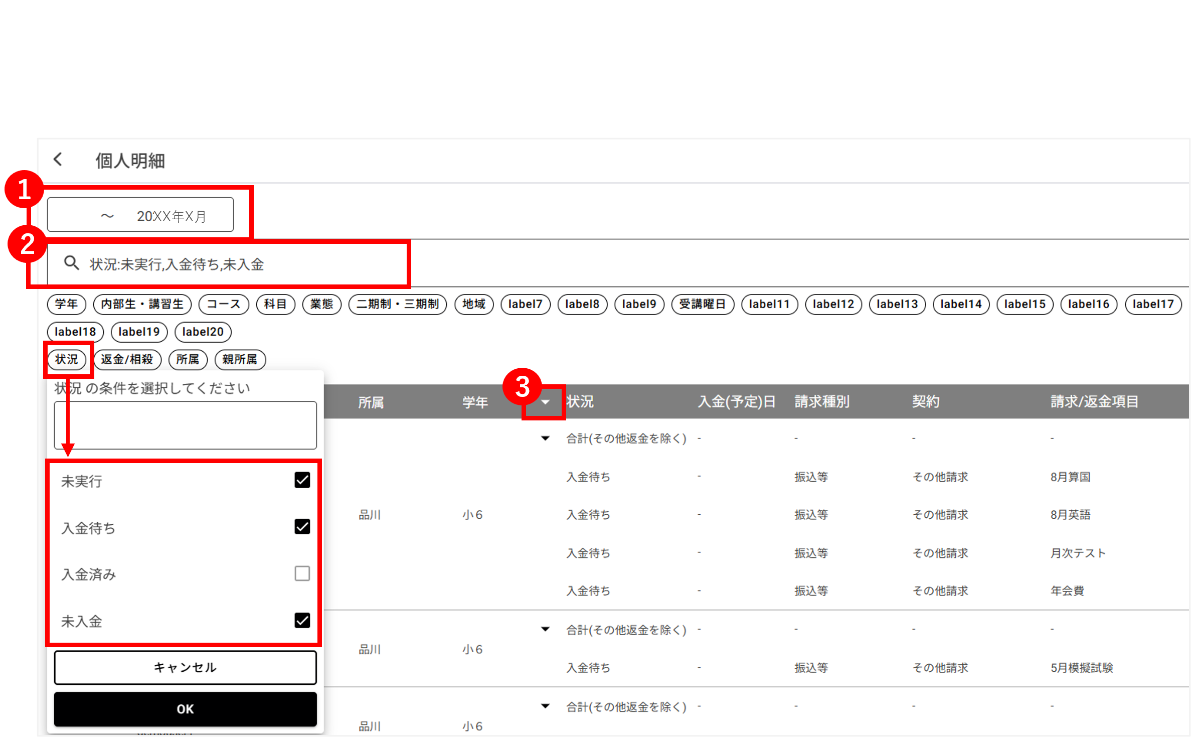 - 個人明細で「入金待ち」や「未実行」「未入金」がないか確認