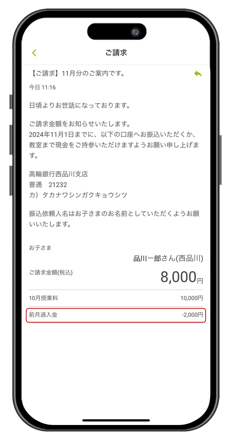 2024.10.24 2024.11.05 マイナスの請求データをアップロードすることはできますか? 203view 請求額通知,よくある質問 お気に入り 合計金額がマイナスでなければ可能です。 「その他請求」から請求データ(CSVファイル)をアップロードする際、対象生徒の合計金額がマイナスにならなければデータの中にマイナス表示を入れることができます。 過不足金等の内訳を表示させたい場合にご利用ください。 <保護者アプリイメージ> 一覧に戻る 関連記事 組織ユーザー:組織アプリのログインパスワードを忘れてしまいました 2024.07.17 配信先検索条件を設定後、「配信先選択」を押しましたが対象者が出てきません。 2025.07.29 「契約があるためユーザーを削除できませんでした」という内容のメールが来ましたがどうしたら良いですか? 2024.08.09 請求実行前に明細を確認する 2023.09.25