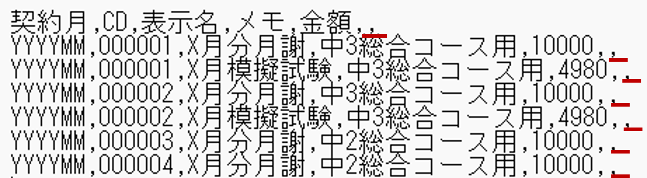 アップロードするCSVファイルの金額は桁区切りのカンマを入れずに入力してください。