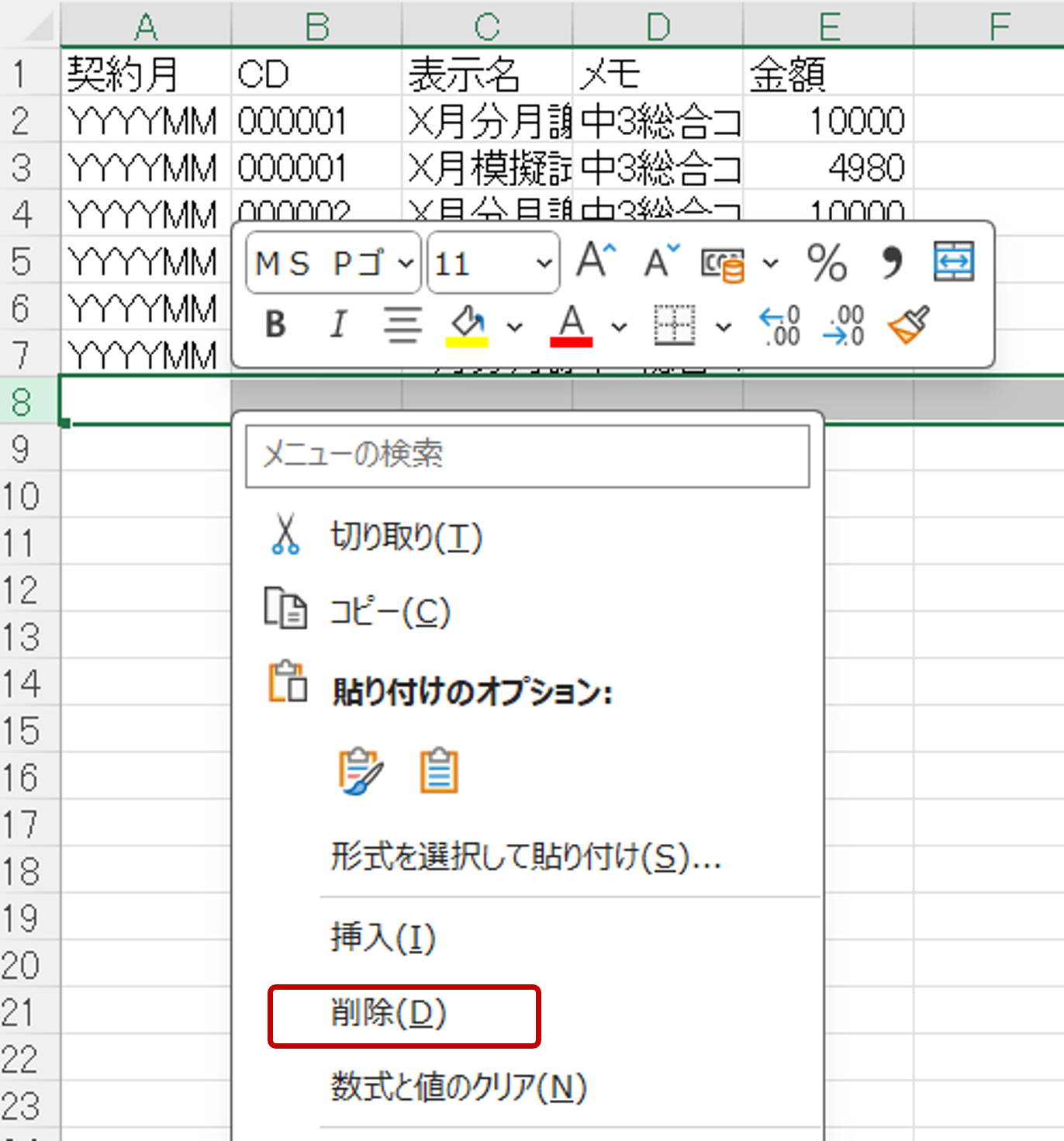 ②CSVファイルをExcelで開き、対象の行を削除して上書き保存