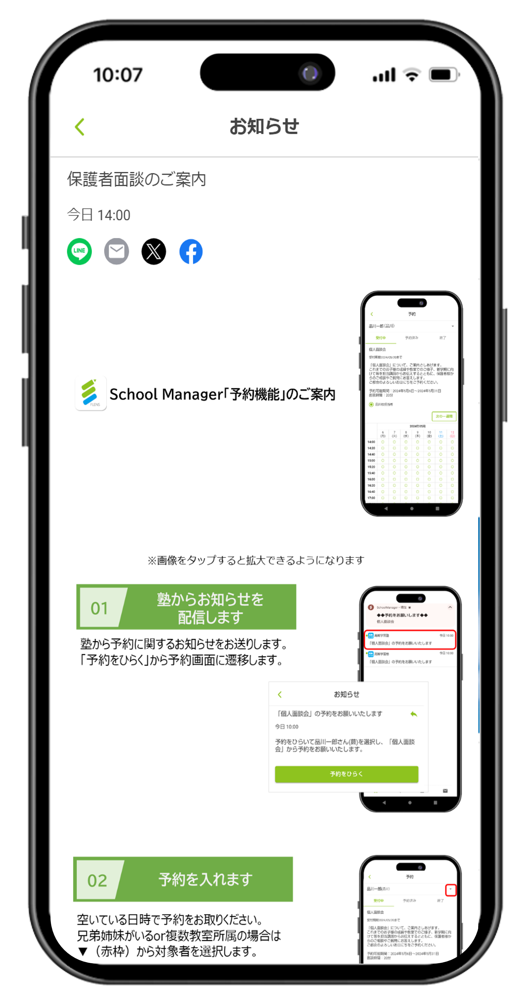 2024.11.21 2025.03.21 【配信用】各機能利用開始のお知らせ配信用テンプレート 675view 保護者・生徒向け案内テンプレート お気に入り 導入後、新たな機能を利用開始する際は、お知らせ機能を使って保護者に通知することができます。 保護者アプリへの配信イメージ1(ホーム画面) 保護者アプリへの配信イメージ2(お知らせ詳細画面) お知らせ配信用テンプレートをダウンロードする 以下のリンクから配信用素材(テキスト・画像)をダウンロードしてください。 出席状況 メッセージ 申込/回答 予約 ライブラリ 請求額通知 口座振替 ファイルの内容は各機能同じ構成になっております。 <機能名>の部分はダウンロードした機能によって異なります。 ①利用開始のご案内_お知らせ配信用ひな型 ②画像1_<機能名>_お知らせ一覧表示用アイキャッチ画像 ③画像2_<機能名>のご案内 件名、本文、添付画像を設定しお知らせを配信する 組織アプリでお知らせを作成し、 ❶でダウンロードしたひな形を以下のように設定します。 ※ファイル名の赤文字部分は配信する機能によって異なります。 下図は予約機能の例です。 一覧に戻る 関連記事 【印刷用】ご導入時の配布資料テンプレート 2024.07.24